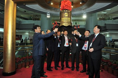 董事长张洪起(右一)敲响上市宝钟