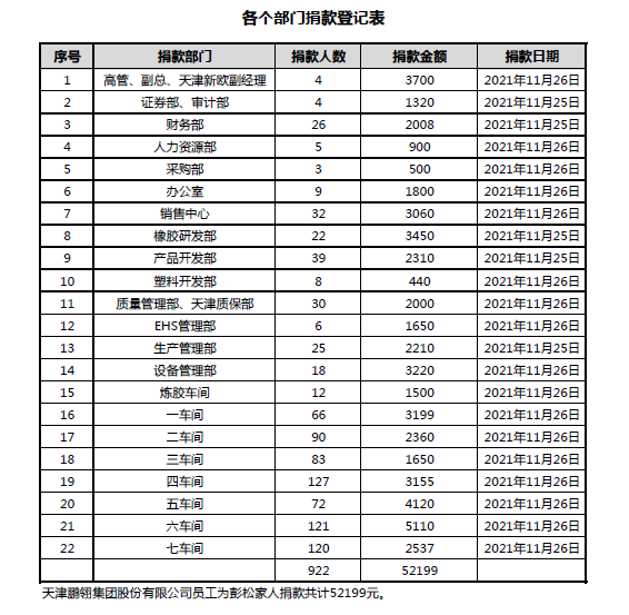 疾病无情,公司有爱!公司领导了解情况后,第一时间决定向去世员工家属捐赠2万元慰问金。与此同时,公司工会向全体员工发出了“爱心捐款倡议”,公司领导们带头捐款,干部职员积极响应,纷纷伸出温暖之手,打开爱心之门,一股暖流在公司内部涓涓流淌。短短两天,共有920名员工参与捐款,募集善款共计52199元。