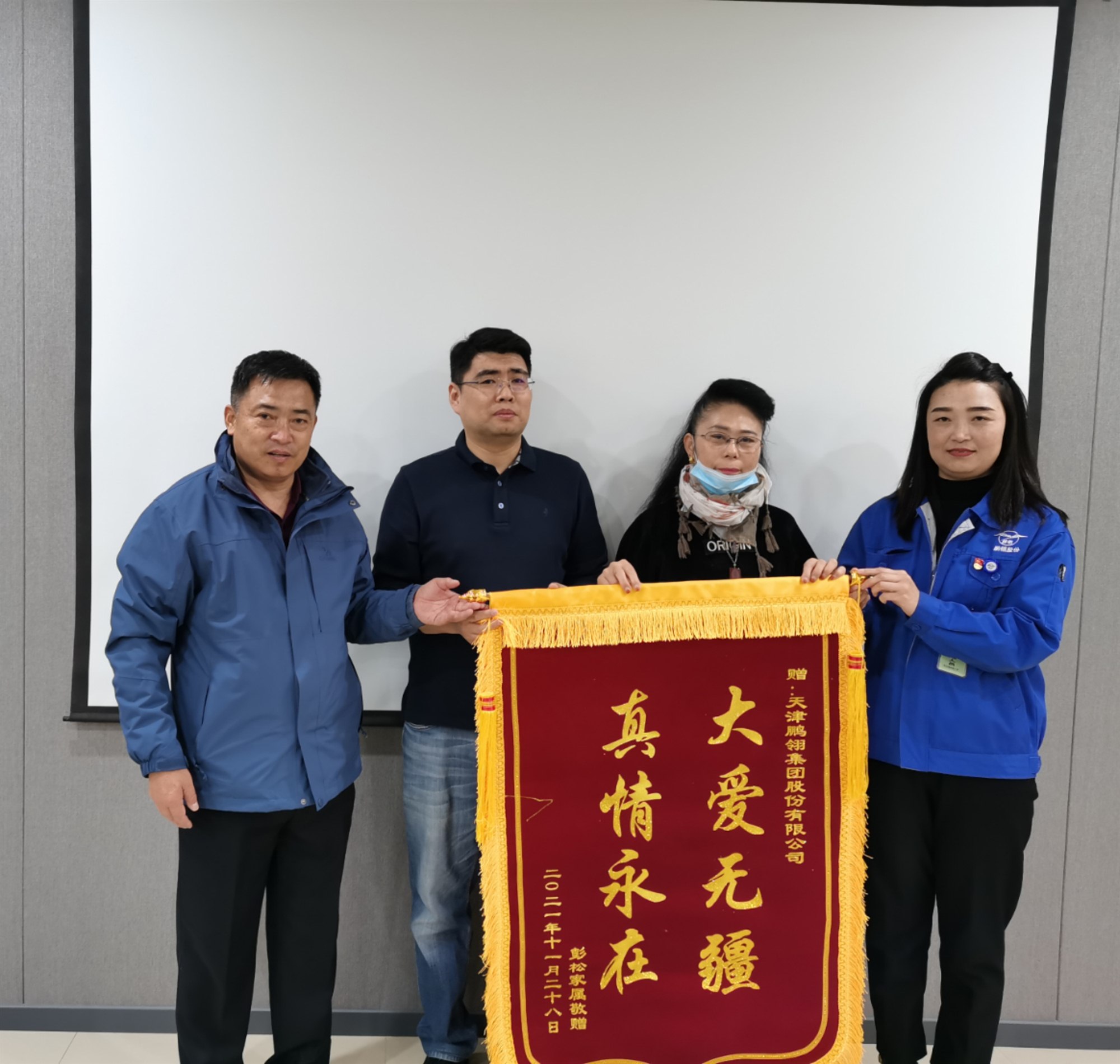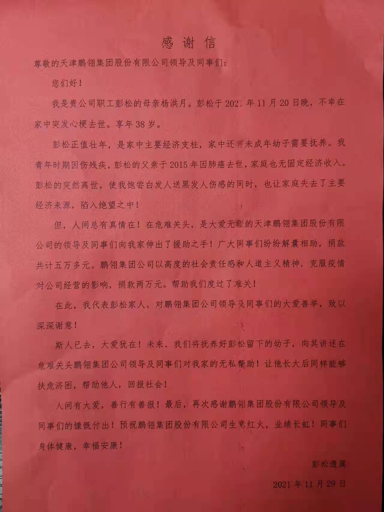 近日,彭松家属来到公司,对公司的慷慨解囊、对各级领导和员工们的无私帮助表达了深深的谢意,并当面送上了感谢信和锦旗。